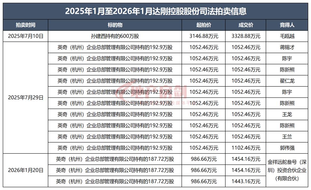 值得注意的是,在刚刚过去的2025年,除了达刚控股原实控人孙建西持有的达刚控股600万股在2025年7月10日进行司法拍卖之外,英奇(杭州)企业总部管理有限公司持有的达刚控股1929万股拆分成10个标的在2025年7月29日也进行了司法拍卖。