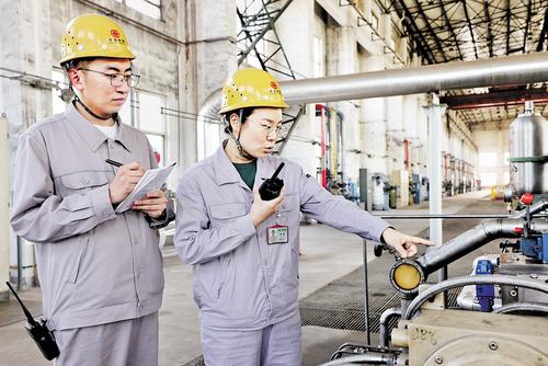2025年9月9日,邓晶(右)在开滦集团中润公司甲醇分厂讲解合成设备知识。开滦集团唐山中润煤化工有限公司供图