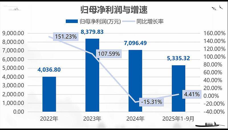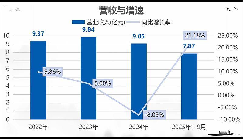 业绩方面,2022-2024 年公司营收分别为 9.37 亿元、9.84 亿元和 9.05 亿元;2025 年 1-9 月,公司营收为 7.87 亿元,与上年同期相比增长 21.18%。