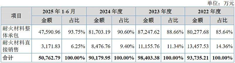 公司主营业务收入包括耐火材料整体承包和耐火材料直接销售。2022 年-2025 年 H1,公司耐火材料整体承包收入分别为 80,277.68 万元、87,247.62 万元、81,703.19 万元和 47,590.96 万元,占主营业务收入的比例分别为 85.64%、88.66%、90.60%和 93.75%,占比逐年上升,是公司主营业务收入的主要来源。