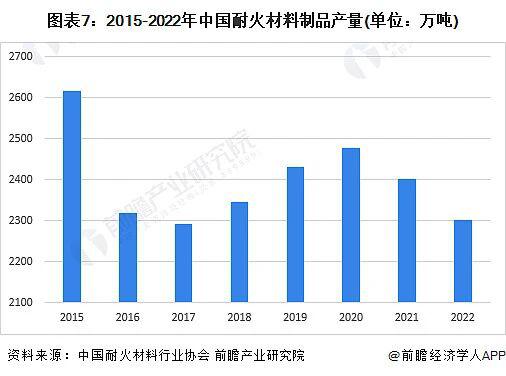 据中国耐火材料行业协会统计,2022 年中国耐火材料制品产量为 2301 万吨,虽然同比下降了 4.23%,但市场规模仍保持在较高水平,约为 1798.1 亿元人民币。2023 年尽管面临国内外复杂形势的影响,中国耐火材料产量仍达到 2298 万吨,同比下降 0.14%,降幅进一步收窄。