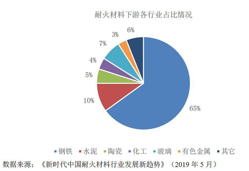 从耐火行业下游来看,耐火材料广泛应用于钢铁、水泥、陶瓷、玻璃、化工、有色等高温工业相关领域。钢铁行业占耐火材料使用总量的 65.00%左右。由于炼钢所有环节都需要耐火材料,且个别环节对耐火材料消耗侵蚀严重,更换速度快,因而钢铁行业对耐火材料需求最多。