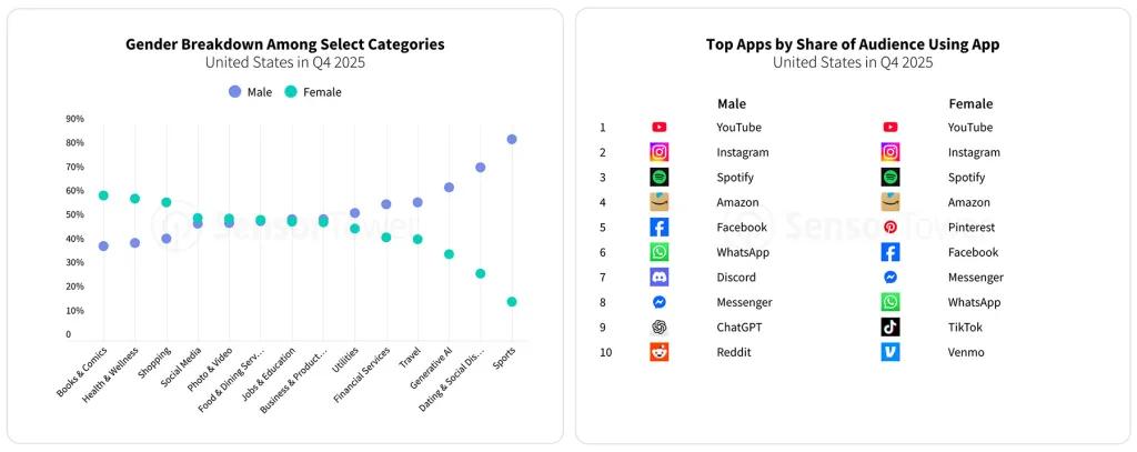 AI 应用是 2025 年增长最迅猛的领域。ChatGPT 的下载量激增 148%,内购收入增长 254%,总使用时长更是惊人地暴涨了 426%,跃升至全球应用下载榜第二位。