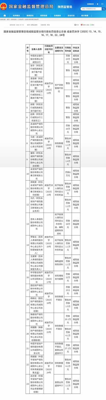 日前,国家金融监督管理总局咸阳监管分局集中公示了多份行政处罚决定,涉及中国农业银行咸阳分行及 6 家保险机构,累计罚没金额超过 160 万元。