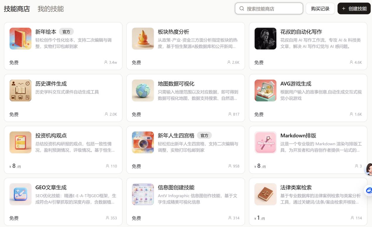 事实上,新京报贝壳财经记者在扣子平台的“技能商店”中就看到了不少其他用户上传的“技能”,包括创造历史课件、分析股票板块热度、创建新年绘本等。其中,一个名为“花叔的自动化写作”的技能已经有4800人安装。创作者“花叔”表示,该技能已经“运行迭代2个月 20 版以上,产出10篇以上1万+阅读文章。”