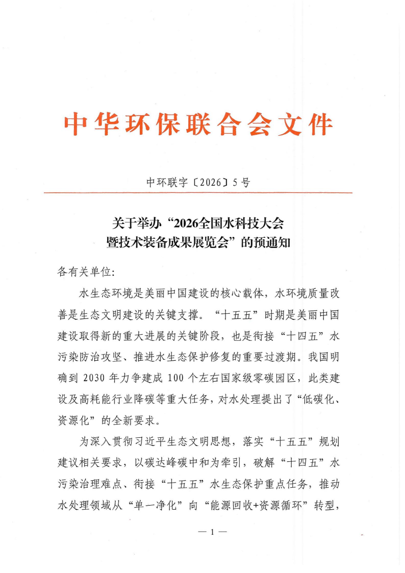 中华环保联合会关于举办“2026全国水科技大会暨技术装备成果展览会”的预通知