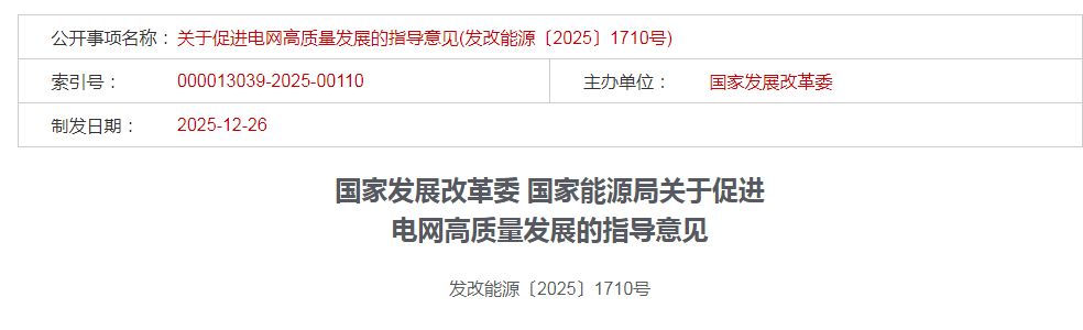 2025年12月26日,国家发展改革委和国家能源局联合发布的《关于促进电网高质量发展的指导意见》(以下简称“1710号文”)中明确指出,要破解民生用电堵点卡点,加快补齐农村配电网短板,实现供电可靠性和电压合格率稳步提升。引导分布式电源与城乡电网协调布局,提升电网对分布式新能源的接纳、配置和调控能力,强化分布式新能源对民生改善的促进作用。