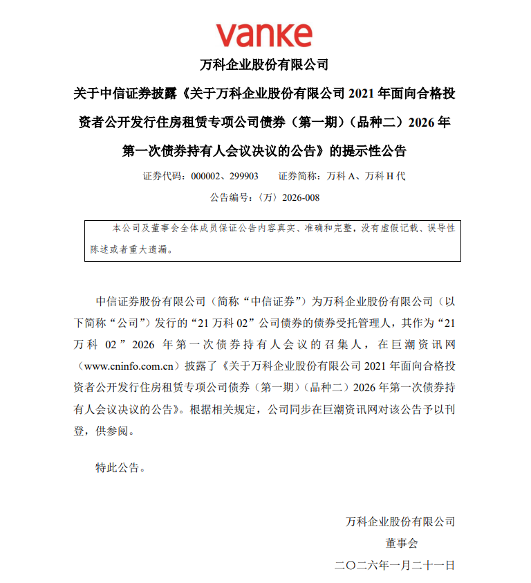 21万科02”债券2026年第一次持有人会议决议1月21日正式公布,议案四以92.11%的高同意率获得通过。这是万科首笔公开债务成功获得展期,暂时避免了实质性违约。
