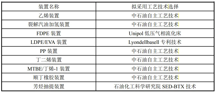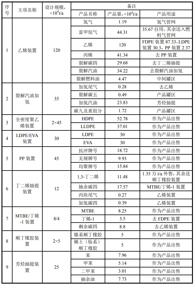 项目组成:乙烯装置、FDPE装置、LDPE装置(具备EVA生产能力)、PP装置、丁二烯抽提装置、MTBE/丁烯-1装置、顺丁橡胶装置、裂解汽油装置、芳烃抽提装置,以及配套的公用工程、辅助生产设施和储运设施等。