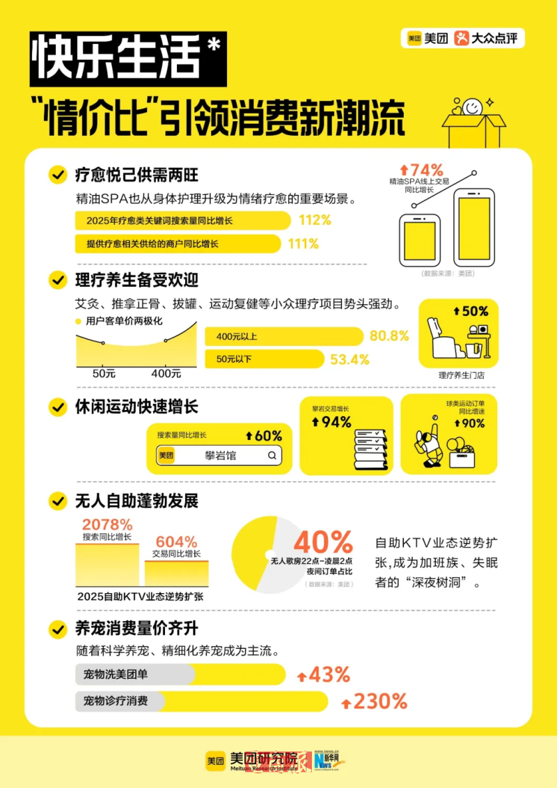 2025年,越来越多人为自己的情绪和感觉买单,疗愈类服务消费供需两旺。报告显示,2025年疗愈类关键词搜索量同比增长112%,提供疗愈相关供给的商户同比增长111%。运动和养生成了快速“回血”的新选择,驱动艾灸、推拿、拔罐等理疗养生类实体门店数增速接近50%。羽毛球、网球、攀岩等休闲运动持续风靡,2025年攀岩馆搜索量同比增长60%,交易增长94%,羽毛球、网球等球类运动订单量同比增速超90%。