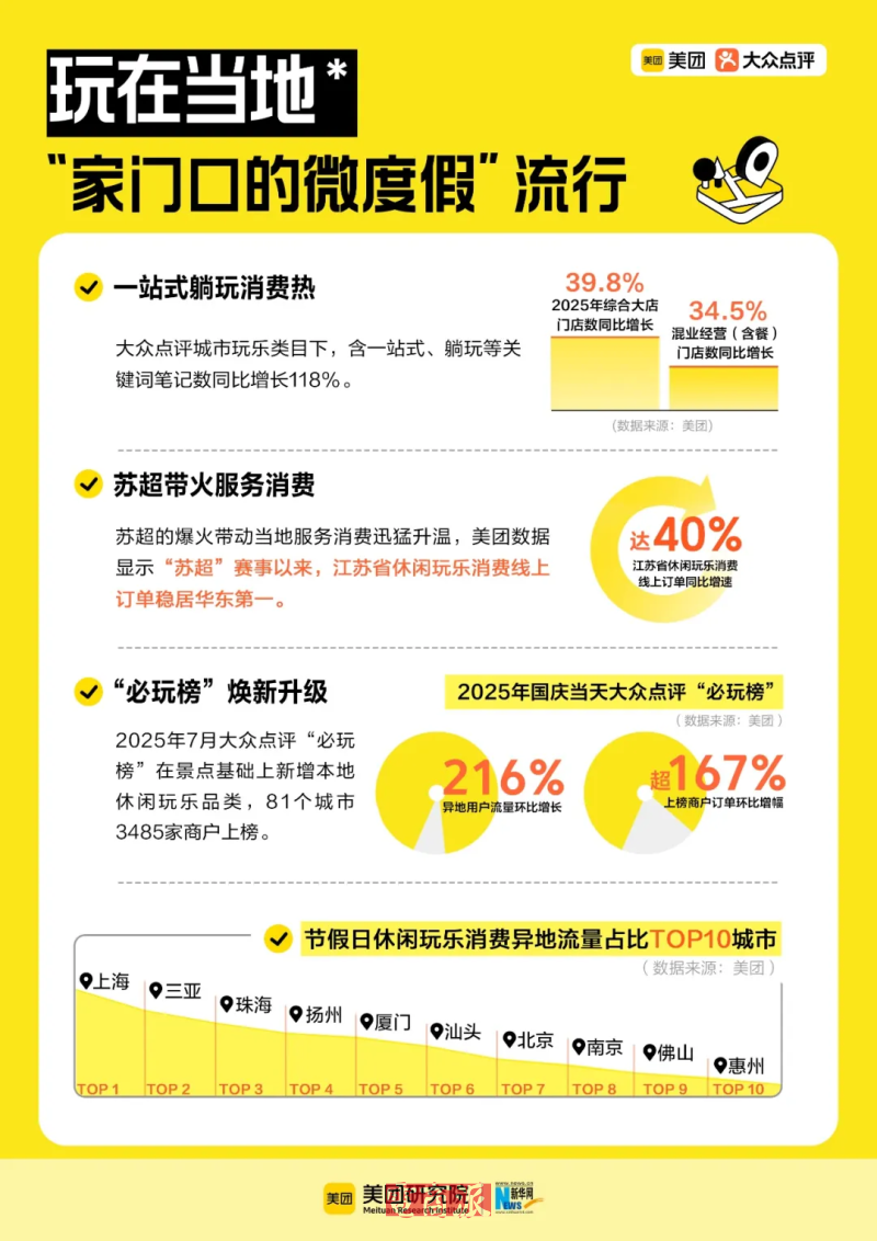 2025年,一座城的吸引力,正从传统的名胜古迹、旅游度假区,演变成一场演唱会、一场足球比赛、一部影视剧等等。充满本地特色的服务与体验,日益成为吸引人们前往打卡一座城市的重要理由。2025年冬季,东北洗浴中心挤满了体验搓澡的南方游客,甚至包括不少外国人。以2026洗浴指南三钻商户“沐里沐外”为例,异地消费用户占比超40%。苏超的爆火带动当地服务消费迅猛升温,开赛以来,江苏省休闲玩乐消费线上订单稳居华东第一,同比增速达到40%左右。