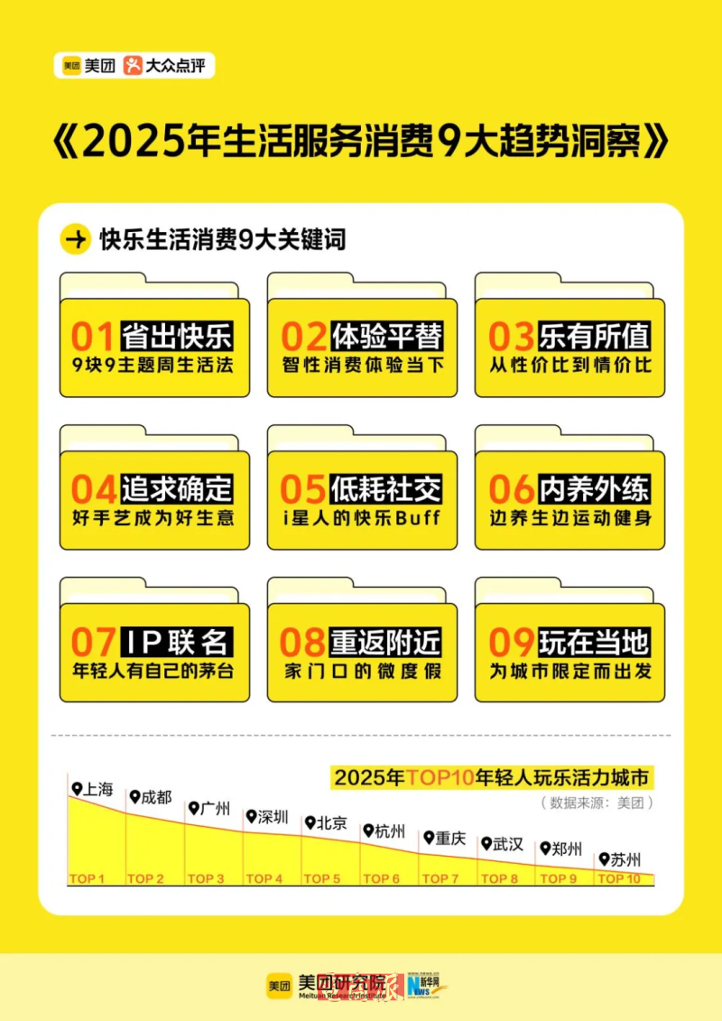 1月22日消息,新华网联合美团研究院发布《2025生活服务消费趋势洞察》。2025年,美团平台上与“快乐生活”相关的服务消费订单量同比增长36%,95后消费者占比近6成。上海、成都、广州、深圳、北京、杭州、重庆、武汉、郑州、苏州位列TOP10年轻人玩乐活力之城。