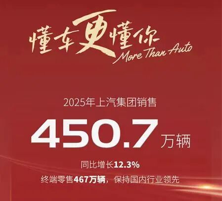 2025年全年,上汽销售整车450.7万辆,同比增长12.3%;终端零售达467万辆,稳居行业前列;其中新能源汽车销量164.3万辆,同比大增33.1%;海外销量107.1万辆,同比增长3.1%。