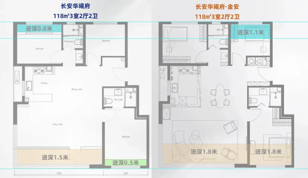 包括78㎡的2 1小三居,96㎡南向三面宽的功能三居,118㎡南向两面宽的舒适三居。