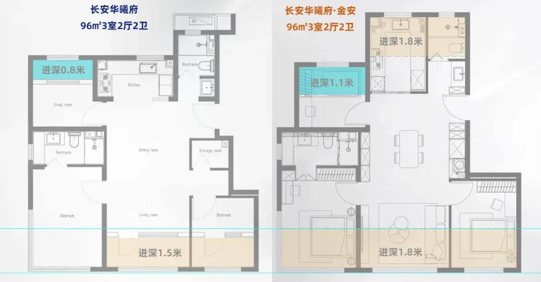 96㎡户型加赠更多,延展空间18.2㎡,实际使用率93%。