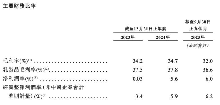 盈利能力方面,君乐宝的经调整净利润从2023年的6.0亿元增至2024年的11.6亿元,2025年前三季度为9.4亿元;经调整净利润率从2023年的3.4%提升至2024年的5.9%,2025年前三季度进一步增至6.2%,增长叠加赚钱能力是港股偏爱的结尾,也是当前乳业最稀缺的能力。