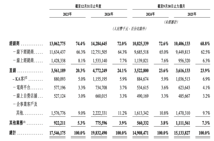 2025年前三季度,经销商渠道仍贡献了约68.8%的收入,直销渠道(含KA、电商、自营店)则为23.9%。