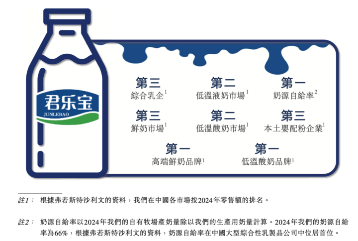 在招股书中,君乐宝引用弗若斯特沙利文(Frost & Sullivan)数据,按2024年中国市场零售额计,君乐宝在中国综合性乳制品企业中排名第三,市场份额为4.3%。