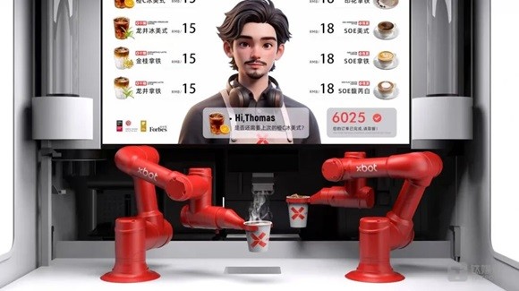 情绪价值作为唐沐设计哲学的核心要素,体现在XBOT的每一个细节之中。为了弱化机械臂拒人于千里之外的冰冷气质,唐沐毅然决定要给咖啡机器人加装43英寸的交互大屏与AI数字人多模态交互系统。不同的数字人咖啡师还被赋予不同的MBTI人格,支持多种语言和方言的实时交互,让用户获得真实“他乡遇故知”的亲近感。当摄像头识别到老用户,数字咖啡师用亲切的乡音主动喊出用户的名字并推荐道“还是老样子一杯少冰冰美式”,行业所普遍追求的“有温度的具身智能”已经呼之欲出。同时,XBOT重金研发的定制拉花能力,又让每一杯咖啡成为“可饮用的社交货币”,这种“裂变”的营销玩法自然也传承至腾讯领先全球的社交基因。