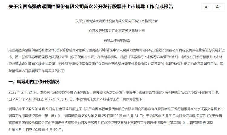 2025 年 2 月 24 日,定西高强聘请一创投行担任公司首发上市辅导机构,并于同日向甘肃证监局报送了上市辅导备案材料。甘肃证监局于 2025 年 2 月 25 日确认了公司辅导备案申请。