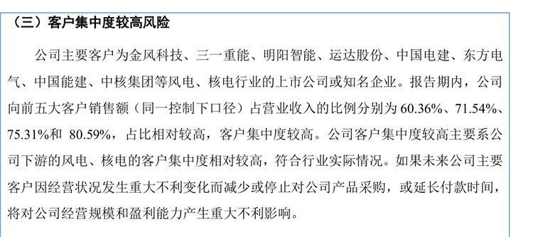 招股书显示,定西高强主要客户为金风科技、三一重能、明阳智能、运达股份、中国电建、东方电气、中国能建、中核集团等风电、核电行业的上市公司或知名企业。报告期内,公司向前五大客户销售额(同一控制下口径)占营业收入的比例分别为60.36%、71.54%、 75.31%和80.59%,占比相对较高,客户集中度较高。