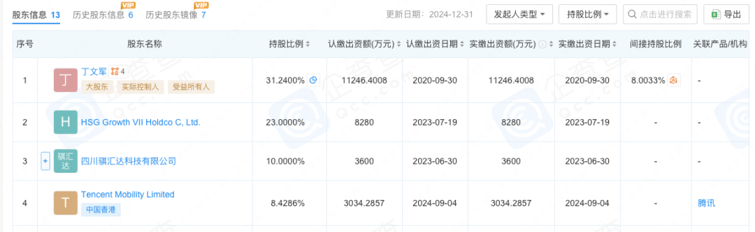 据网络数据披露的最新股东信息,吉香居排名前三的股东分别为持股31.24%的丁文军、持股23%的HSG Growth VII Holdco C, Ltd.,持股10%的股东四川骐汇达科技有限公司,后二者的法定代表人都是丁文军,持股比例排名第四的则是腾讯资本,持股比例约8.43%。
