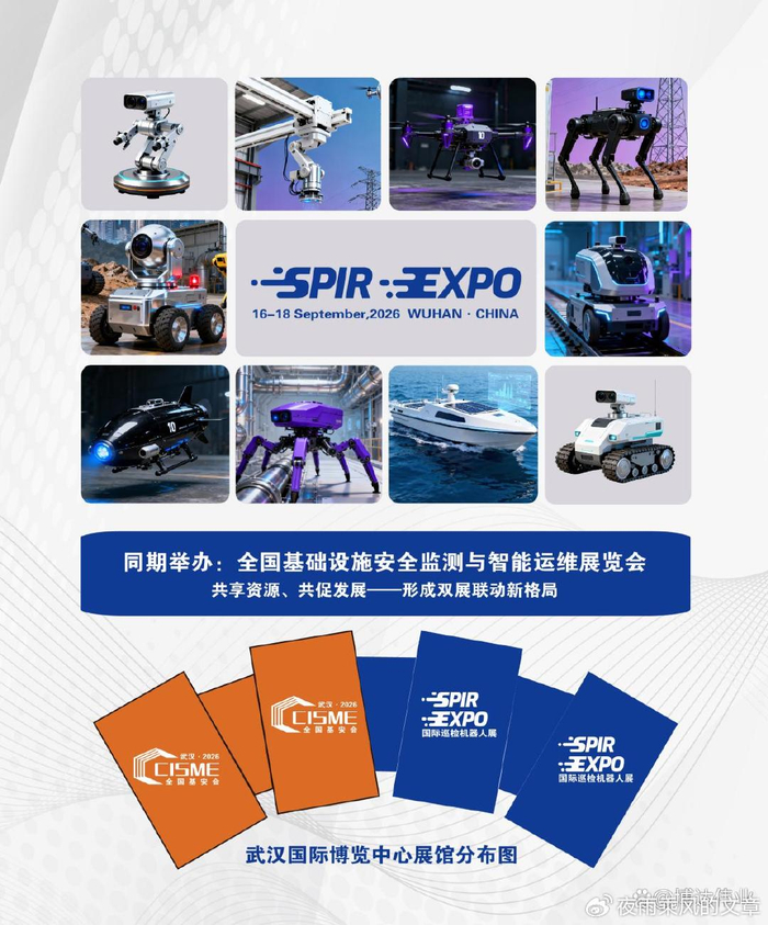 科技赋能千行百业,智巡重构运维生态。作为中国及亚太地区首个深度聚焦智能巡检机器人领域的国际性专业盛会,2026中国国际智能巡检机器人展览会(SPIR Expo 2026)将于9月16-18日在武汉国际博览中心盛大启幕。本届展会以“智巡无界·赋能千行——聚焦巡检机器人技术创新与场景落地”为主题,首次实现智能巡检机器人全产业链聚合亮相,汇聚全球顶尖企业、前沿技术与优质资源,搭建起产品展示、技术交流、贸易合作、市场拓展的一站式高端平台,为产业高质量发展注入强劲动能。