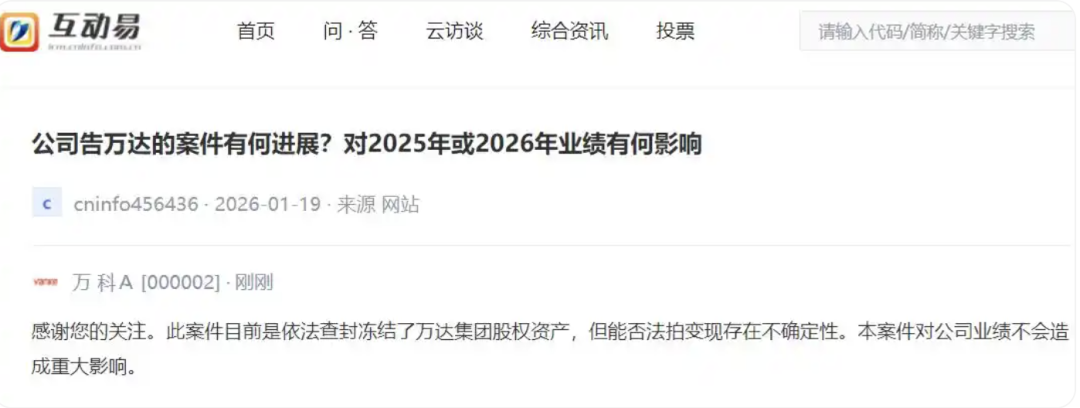 红星资本局1月22日消息,针对投资者关于“ 公司告万达的案件有何进展?对2025年或2026年业绩有何影响?”的提问,万科A(000002.SZ)1月22日在互动平台回应称,此案件目前是依法查封冻结了万达集团股权资产,但能否法拍变现存在不确定性。本案件对公司业绩不会造成重大影响。