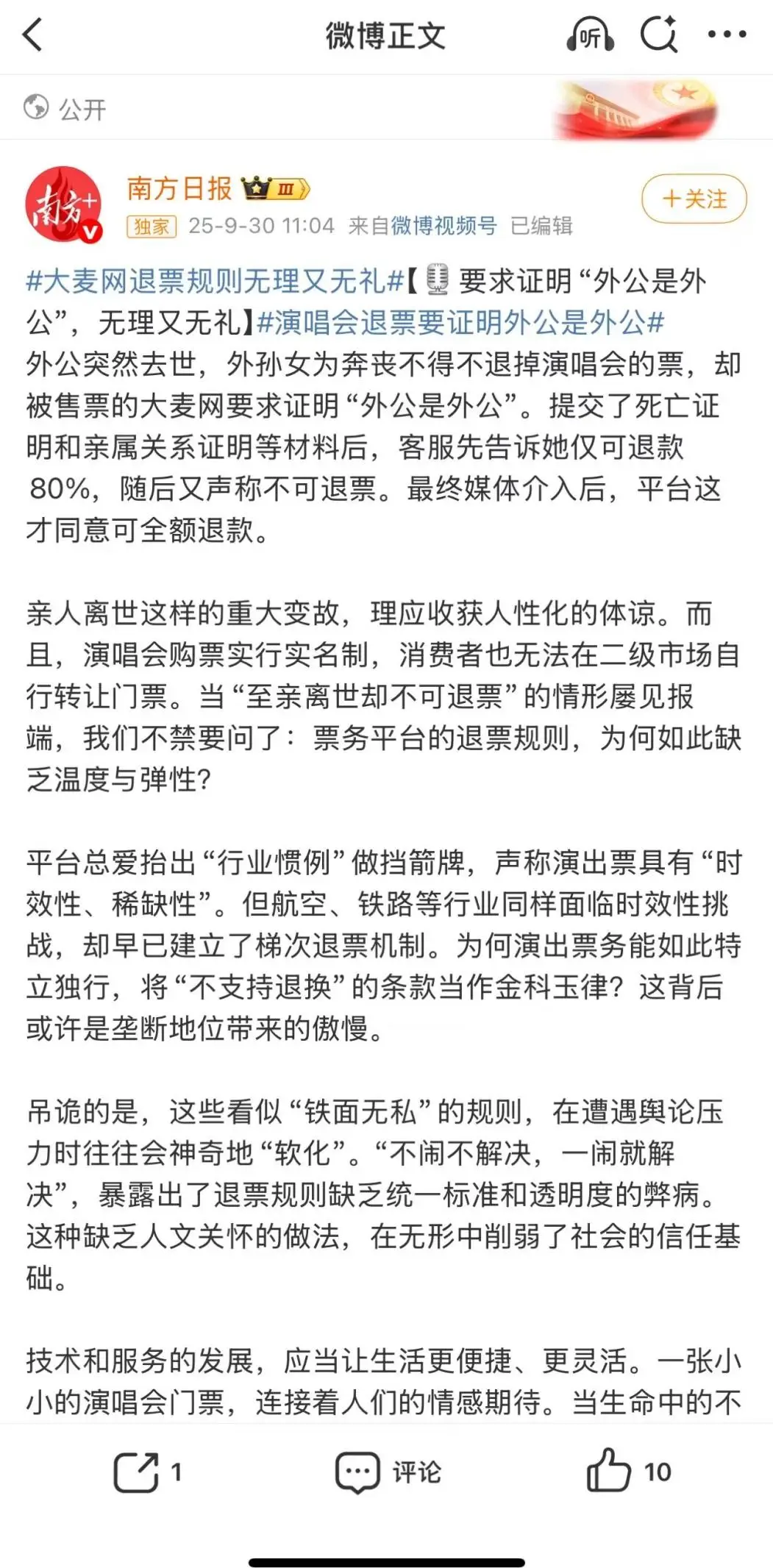 去年9月,大麦类似的案例再次发生并冲上热搜,引来南方日报等一众官媒犀利锐评……