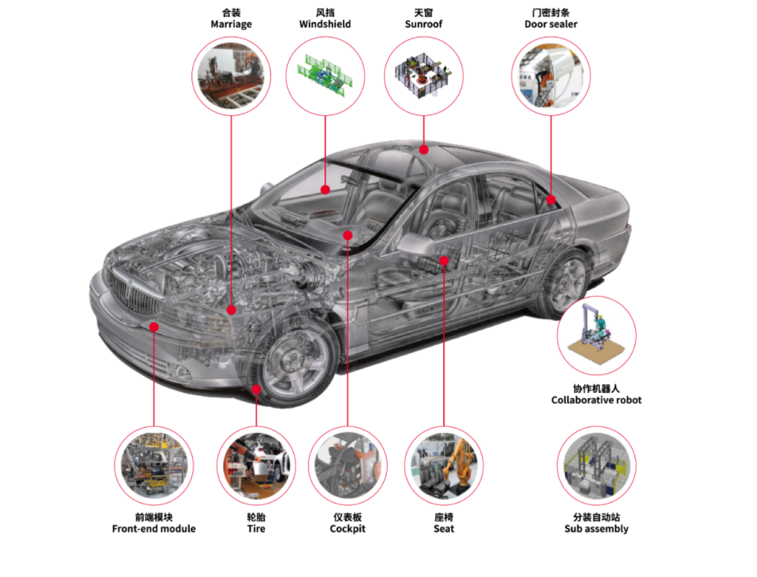 汽车总装业务为汽车装配与新能源领域提供大型系统集成应用,涵盖从工艺方案分析到最终检测的全流程。