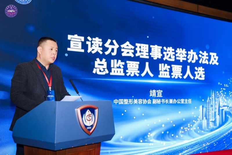 中国整形美容协会副秘书长兼办公室主任靖宣宣读分会理事选举办法及总监票人、监票人选