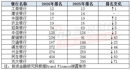 具体来看,此次有多家银行进入上述榜单,包括工商银行、建设银行、中国银行、农业银行、招商银行、中信银行、邮储银行、交通银行、浦发银行、兴业银行、民生银行、光大银行等。与2025年榜单相比,光大银行排名下滑最多,降71个名次至461位;其次是民生银行,降60个名次至404位。