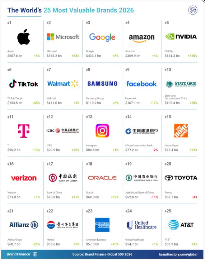 从全球整体排名看,苹果居于最具价值品牌首位,其品牌价值增长5.8%,达到6076.4亿美元;其次是微软,其品牌价值增长22.6%,在2026年达到5652.5亿美元;第三位是谷歌(品牌价值增长4.9%,达到4330.8亿美元)。