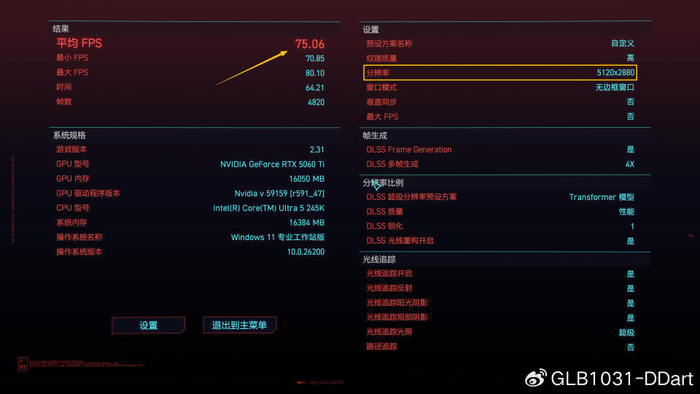 一个跑题的测试,在搭配RTX 5060Ti 16GB显卡下测试「2077」游戏在5K分辨率下,开启光线追踪以及DLSS 4时,游戏平均帧数为75.06FPS。可见在开启DLSS 4技术加持下,即便是5K分辨率下依旧可以相对流畅的运行「2077」这样的3A游戏。
