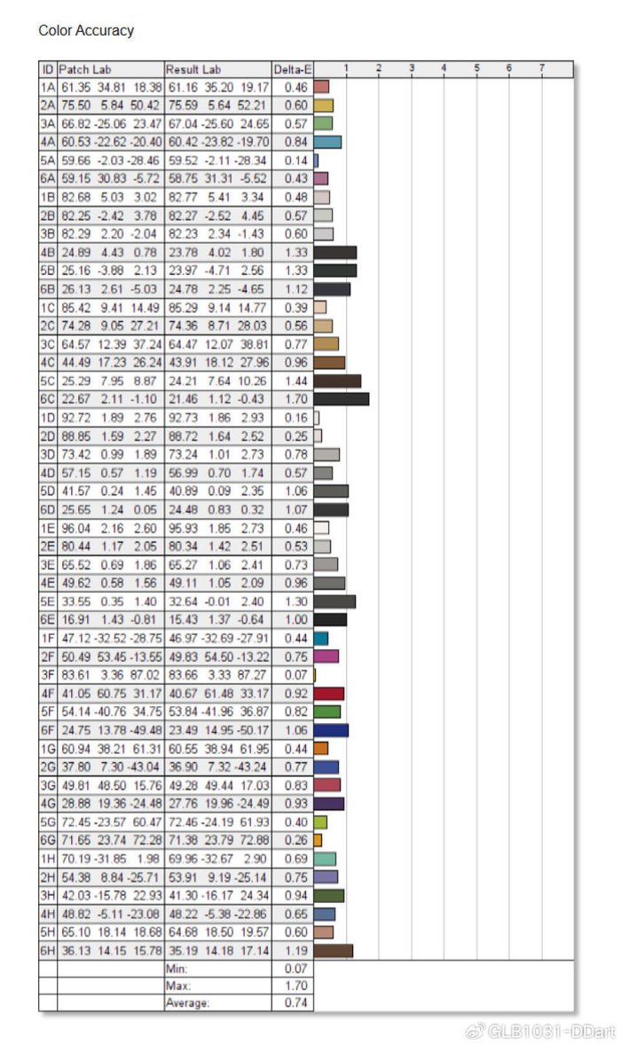 屏幕色彩准确性方面平均ΔE为0.74,最大值也不过1.7。整体色彩准确性水准表现非常不俗,甚至超出了我对它的预期。