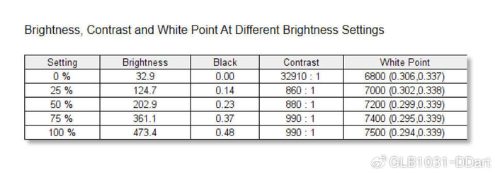 亮度方面,最大亮度473.4cd/㎡,最低亮度32.9d/㎡,对比度在100%亮度下为990:1,白点为7500K。红蜘蛛测试下最高亮度接近500nits,这样色彩表现真的要比同价位的IPS显示器都要好。