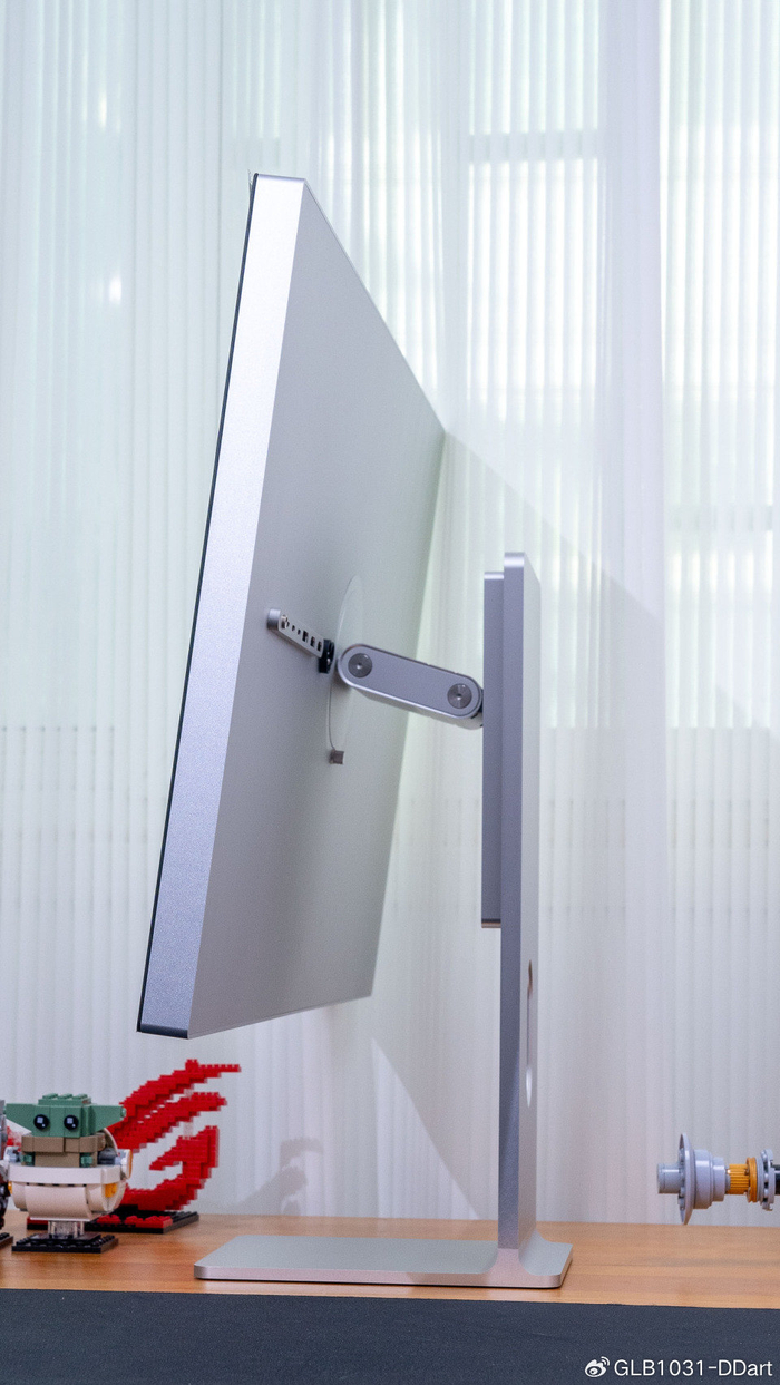 2.2cm厚度的一体系铝合金机身部分,设计上不同于目前主流的传统显示器产品风格。但是不得不说,我觉得蛮好看的。而且内置电源设计,一根供电线就可以了。理线上会更友好。