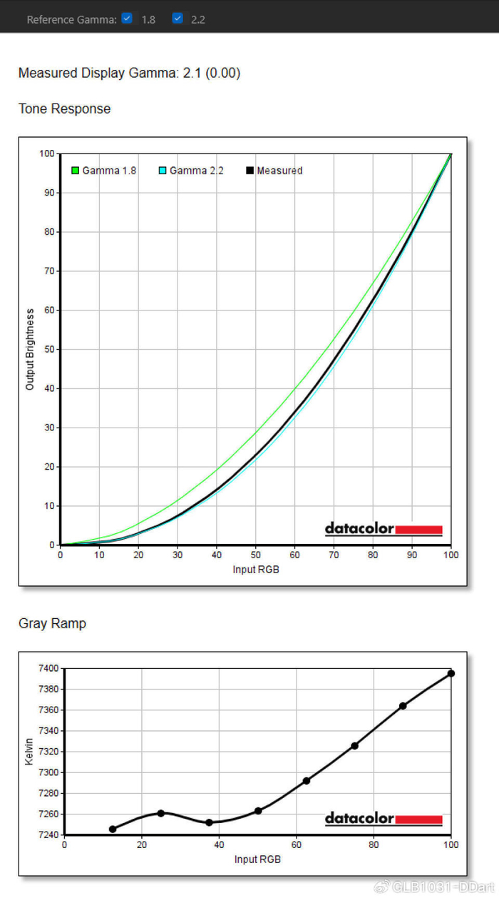 在色调响应方面,光度为2.1,基本和参考曲线贴合。灰阶方面,100%s输入RGB时,色温在7400K左右,整体表现偏冷。