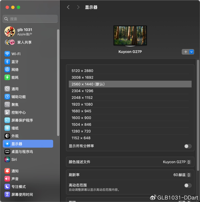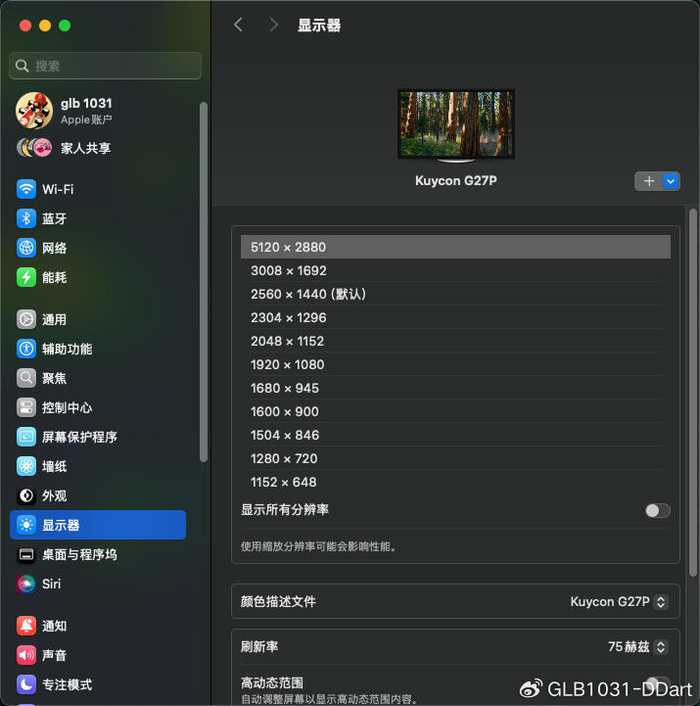 不过在Mac Mini设备上使用HDMI 线材直连G27P的时候是可以设置5K 60Hz,或者48-60Hz可变刷新率的。