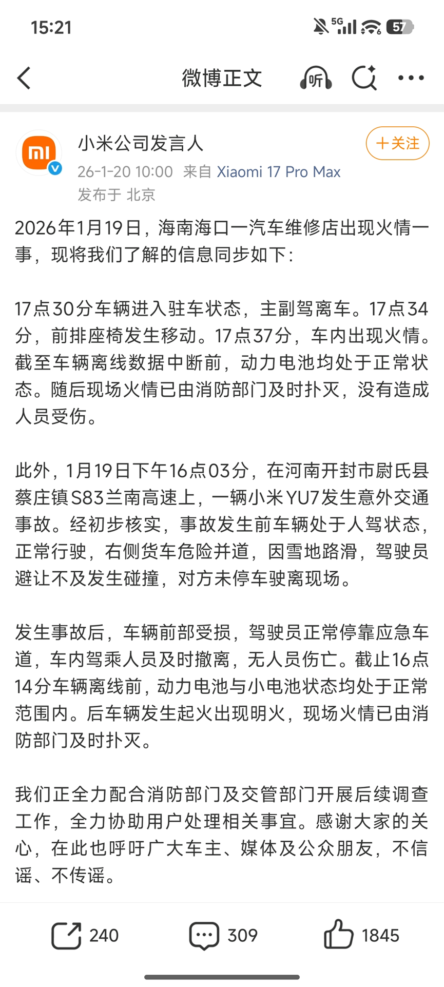 最后,小米表示:“我们正全力配合消防部门及交管部门开展后续调查工作,全力协助用户处理相关事宜。感谢大家的关心,在此也呼吁广大车主、媒体及公众朋友,不信谣、不传谣。”