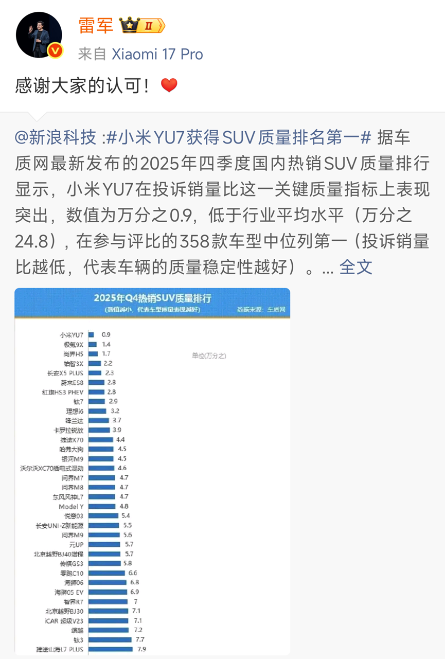 近日,缺陷汽车产品信息收集和汽车消费者投诉信息受理平台“车质网”公布了2025年四季度国内热销SUV质量排行榜。在这份榜单中,小米YU7排名第一,将一众友商甩在了身后。
