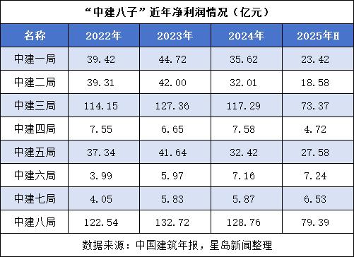 从财务数据看,中建八局的整体实力依然强劲。2022-2024年及2025年上半年,该公司在中国建筑系统内净利润排名一直位居前列;其中2024年净利润128.76亿元,同比下降2.98%,虽有所回落,但仍仅次于中海集团与中国海外发展,在“中建八子”中保持领先地位。
