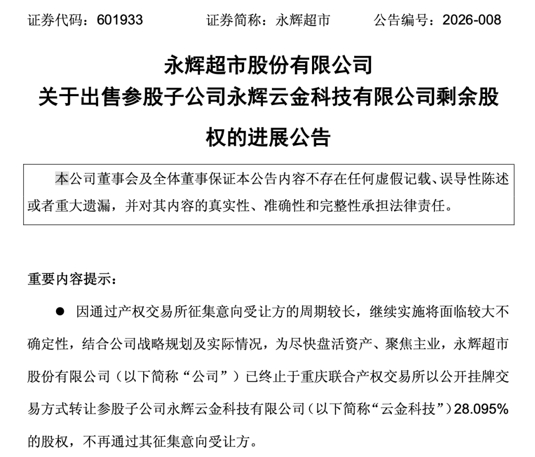 此前,永辉超市于2025年12月31日在重庆联合产权交易所公开挂牌出售持有的云金科技股权,因无意向受让方,公司于2026年1月12日调价至1.53亿元,调价后仍无意向受让方,公司于2026年1月19日调价至1.20亿元。