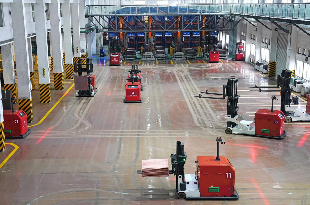 在江铜集团贵溪冶炼厂智能化电解车间,智能机器人转运铜板(1月21日摄)。 新华社记者万象摄