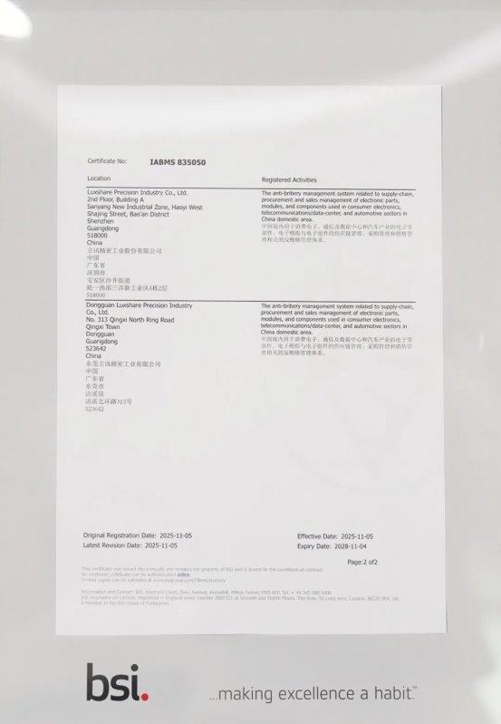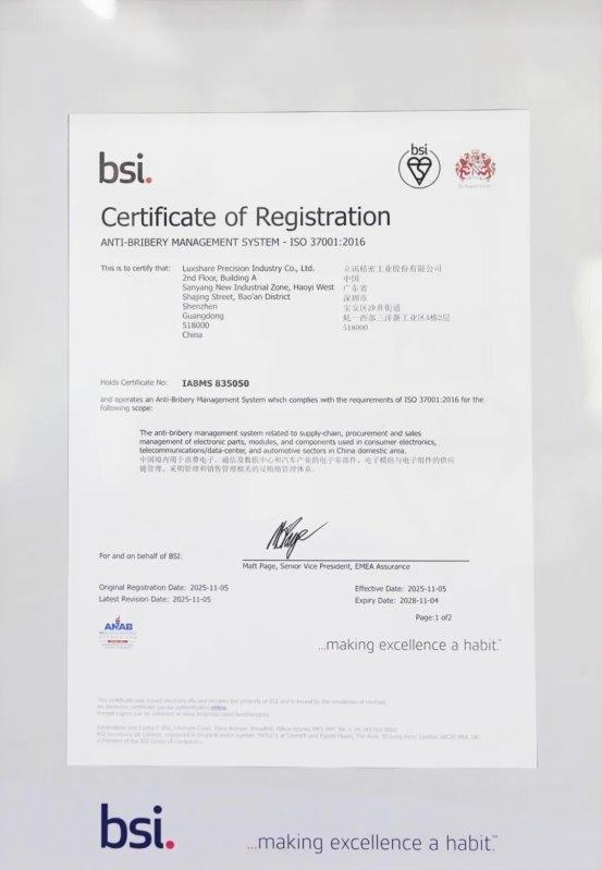 随着全球商业环境对合规治理要求持续提升,廉洁经营已成为企业可持续发展的核心基石,也是构建可信商业生态的关键前提。2025年12月9日,全球权威标准机构英国标准协会(BSI)正式向立讯精密工业股份有限公司(以下简称“立讯精密”)颁发ISO37001:2016反贿赂管理体系认证证书,这一成果标志着公司在廉洁建设与合规治理领域的系统化实践获得国际权威认可,为深化可持续发展迈出了关键一步。