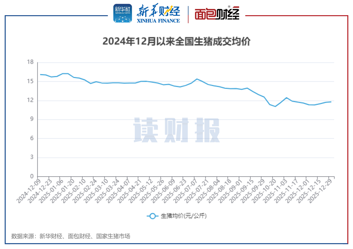 根据国家生猪市场披露的数据,全国生猪成交均价进入2025年以来在15元/公斤上下波动,下半年后开始出现下滑,最低达到11.05元/公斤。2025年12月,生猪成交均价显著低于上年同期水平。