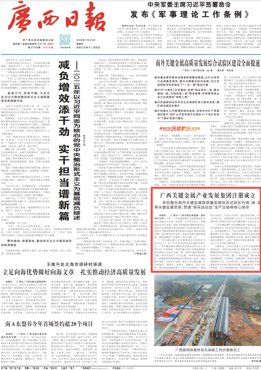 日前,广西关键金属产业发展集团在河池市金城江区完成工商注册,正式宣告成立。该集团是自治区党委、政府为保障国家战略资源安全、推动产业高质量发展而组建的大型国有控股企业,是南丹关键金属高质量发展综合试验区建设的重要支撑,标志着自治区党委、政府在统筹关键金属资源、锻造战略性产业链条上迈出关键一步。