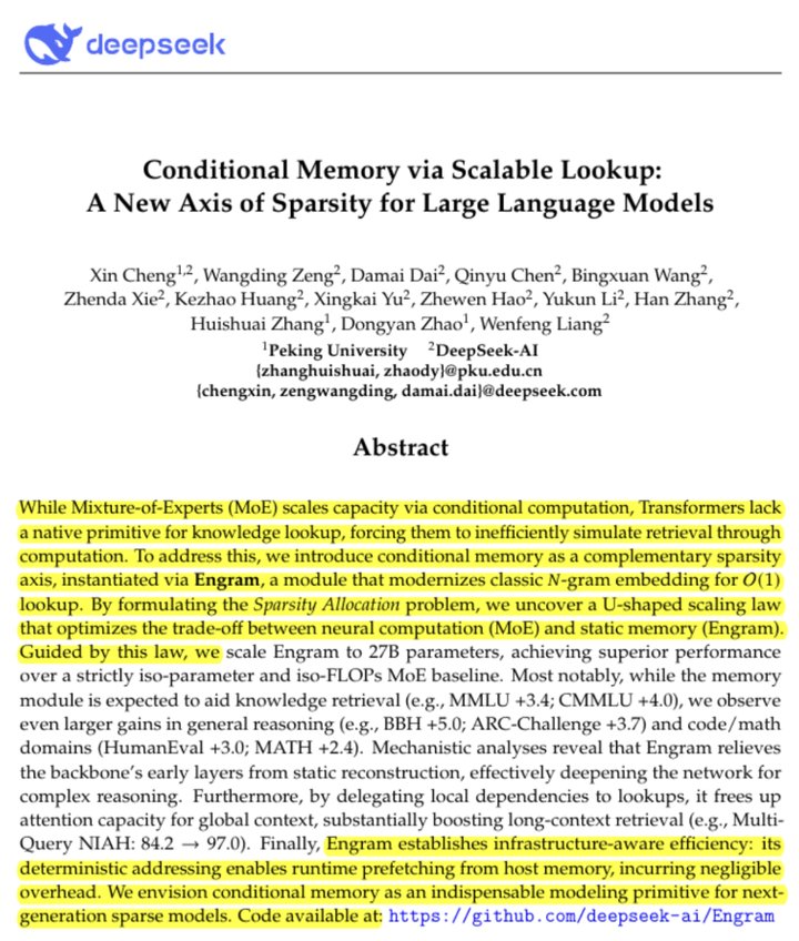 在其刚刚发布的论文《基于可扩展查找的条件记忆:大型语言模型稀疏性的新维度》中,DeepSeek 提出了 Engram 架构。旨在为现有 MoE(混合专家)架构“减负”。