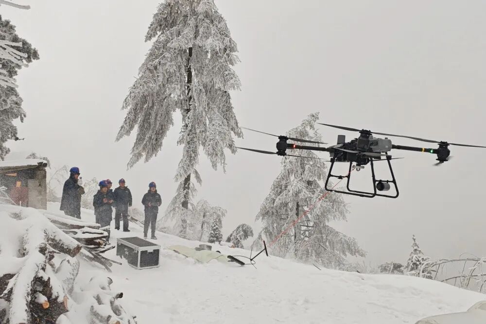 在湖北山区,无人机成为输电线路除冰利器。1月19日,供电员工利用“无人机+除冰棒”对线路开展除冰作业。无人机飞手在大风中稳定操控,精准把握力度,以科技手段高效除冰。