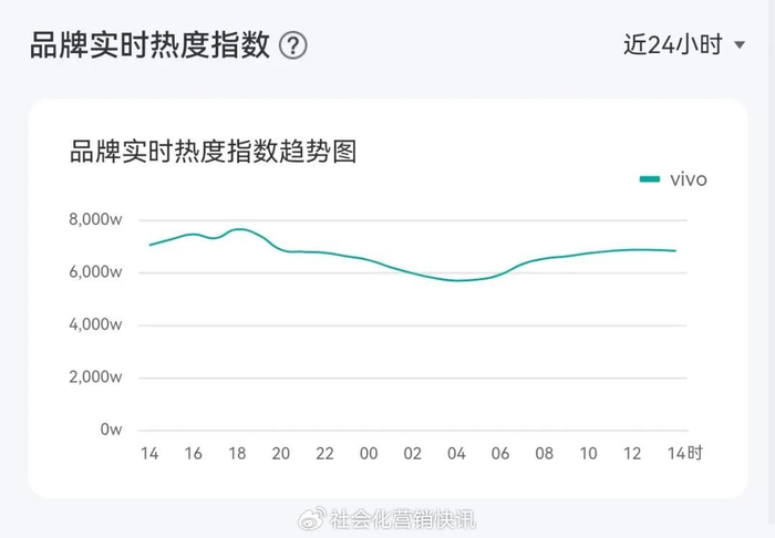 具体操作也很简单,品牌可通过搜索“vivo”,点击“微博指数”按钮进入详情页,查看包括品牌热点数据概览、实时热度指数及热点规模在内的多维度数据。同时,借助详情页中提供的近24小时、近1小时热度趋势图,品牌还能够回顾传播过程中的热度起伏,识别出不同内容主题可能引发的用户反馈差异。